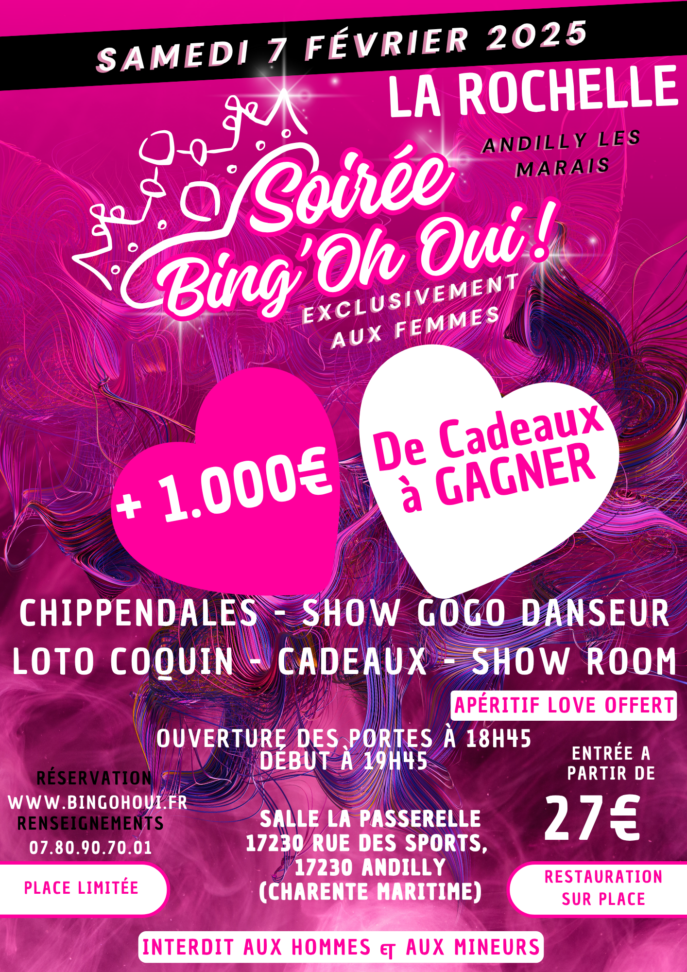 Vous cherchez une soirée unique, où rires, séduction et surprises sont au rendez-vous ? Bing'Oh Oui ! est l’événement fait pour vous ! Que vous soyez en couple, entre amis, ou en quête de nouvelles rencontres, cet événement propose des soirées thématiques dédiées au plaisir, à la complicité, et à l'amusement. À travers des animations et des shows sensuels, Bing'Oh Oui !…