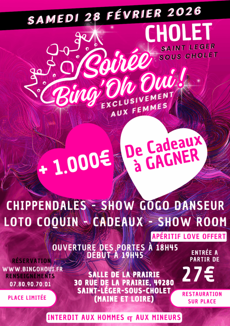 Mesdames, préparez-vous… la fin de l’hiver sera torride dans le Maine-et-Loire ! 🎉 Le samedi 28 février 2026, c’est Saint-Léger-sous-Cholet (près de Cholet) qui accueillera la grande soirée Bing’Oh Oui, placée sous le signe du rire, de la fête et de la complicité féminine.