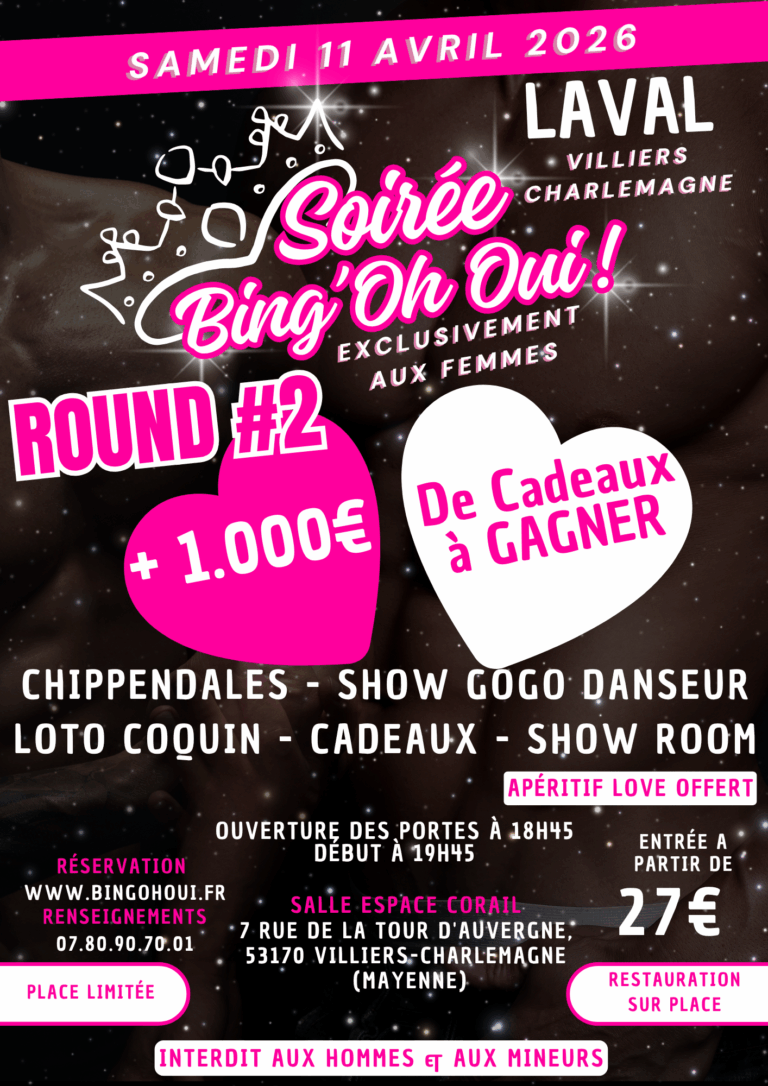 Mesdames, préparez-vous… le Round 2 arrive en Mayenne et ça va être explosif ! 🎉 Le samedi 11 avril 2026, c’est Villiers-Charlemagne (près de Laval) qui accueillera la grande soirée Bing’Oh Oui, placée sous le signe du rire, de la fête et de la complicité féminine.